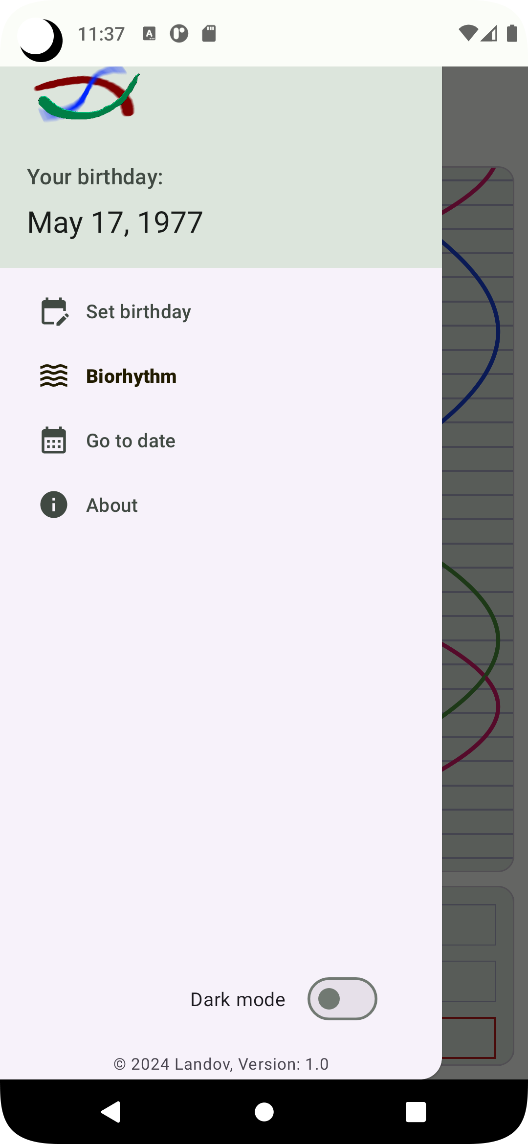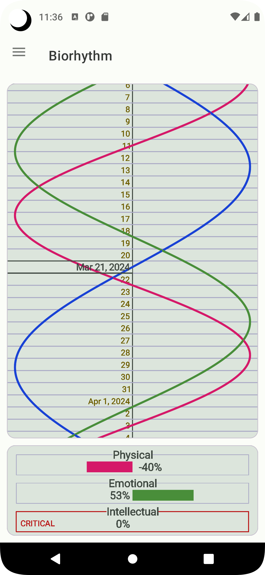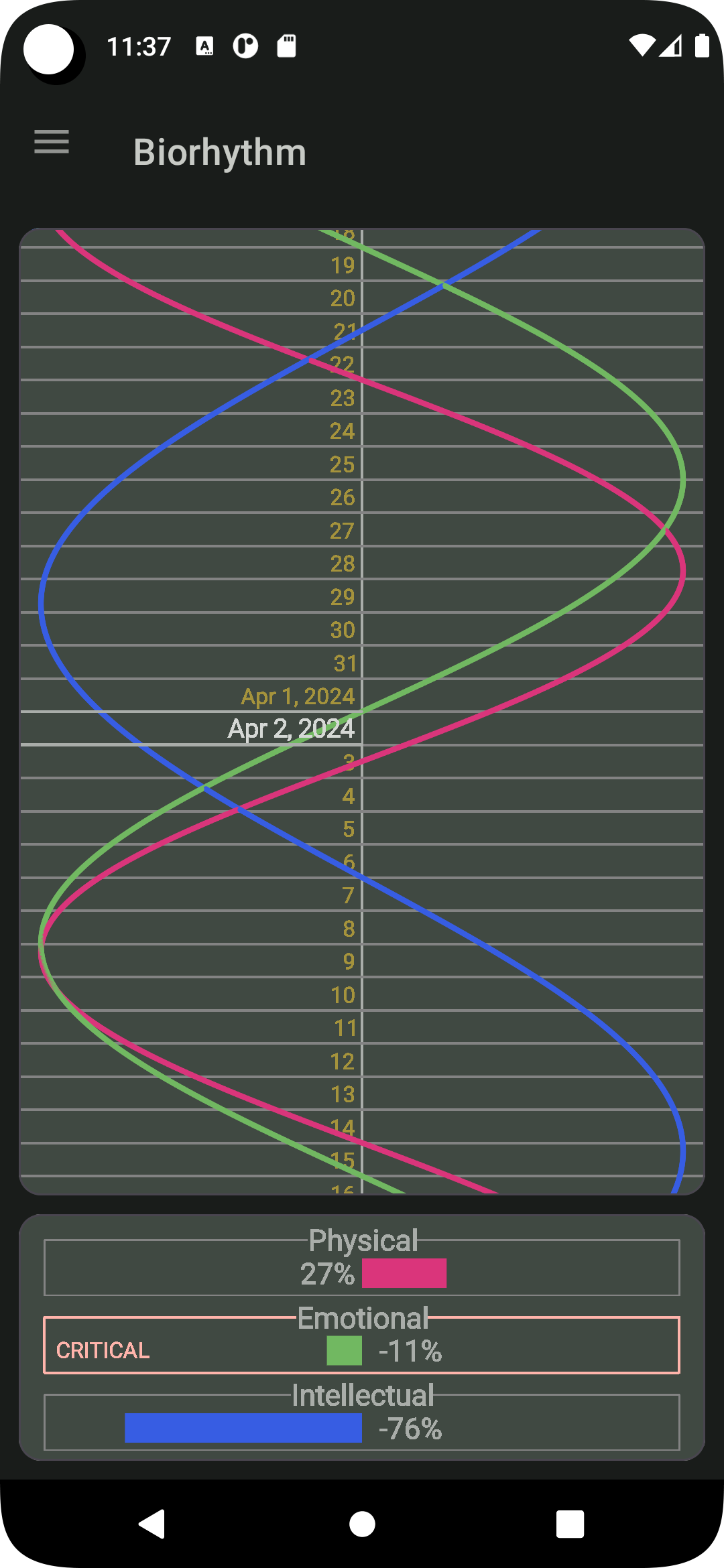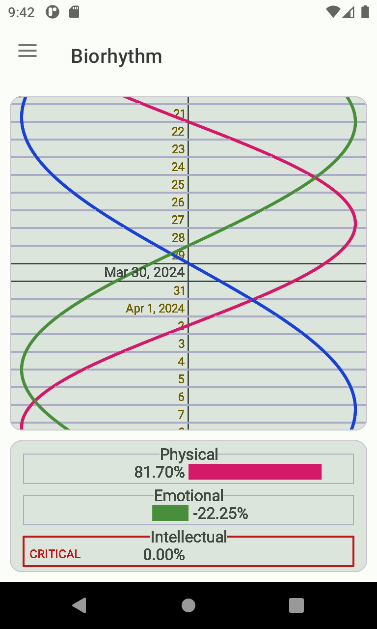 The biorhythm theory was developed by Wilheim Fliess in the late 19th century. The idea is that peoples' daily lives are significantly affected by rhythmic cycles with periods of exactly a 23-day physical cycle, a 28-day emotional cycle, and a 33-day intellectual cycle. Each of these cycles varies between high and low extremes sinusoidally, with days where the cycle crosses the zero line described as "critical days" of greater risk or uncertainty (Source: Wikipedia) Although it has not been scientifically proven that the biorhythm really affects an individual's life, it still can be fun to observe.
