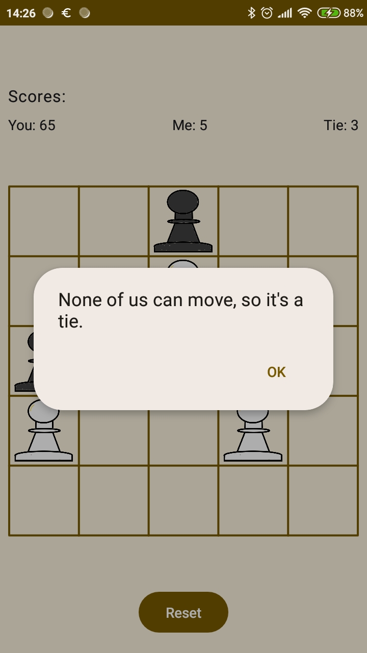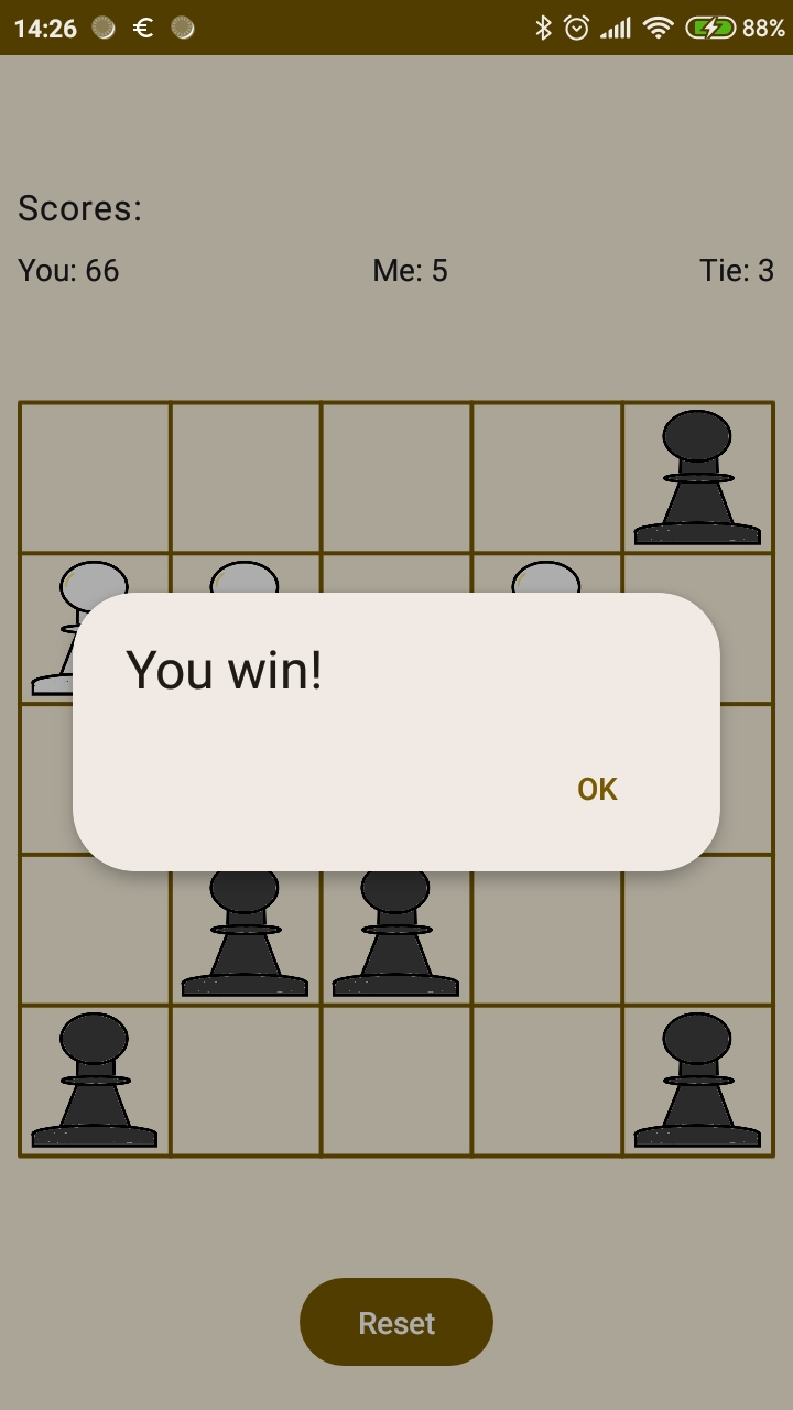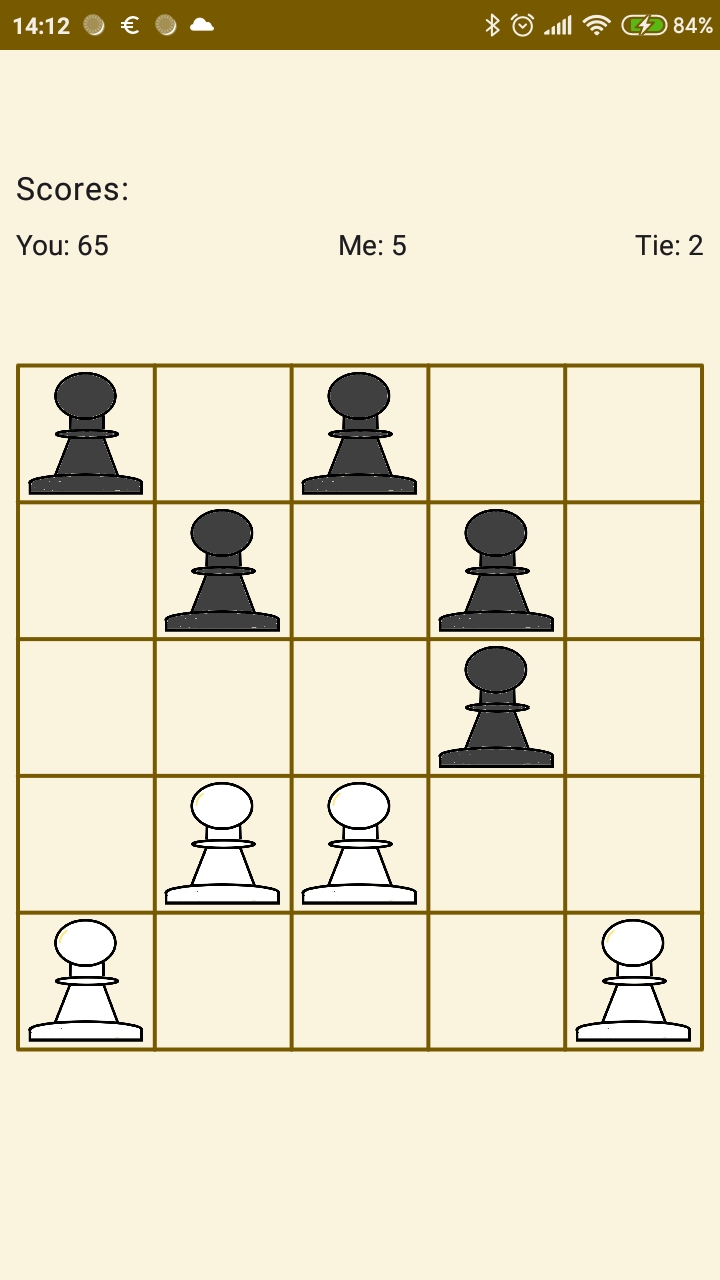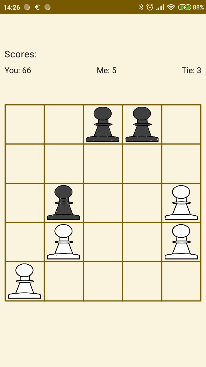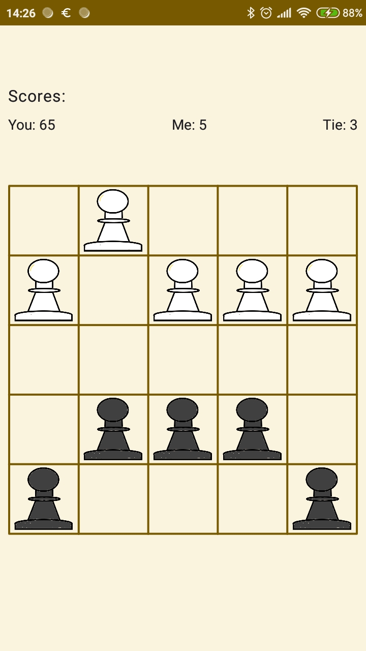 Inspired by the famous Hexpawn game from the seventies. Easy to beat this game but it learns. You will never beat it a same way. The rules are simple. The game played on a five by five grid with five pawns each side. Your goal is to reach the other end of the grid or take all the opponents pawns. You may step one forward or one step diagonally to take a pawn. (Just like in chess).