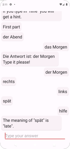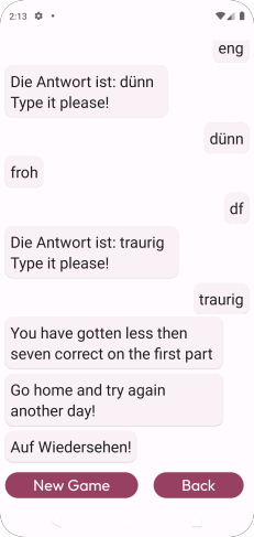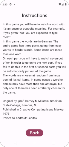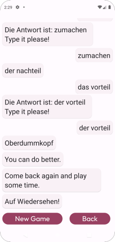 In this game you will have to watch a word with it’s or opposite meaning. For example, if you given “hot” you are expected to type “cold”. In this game the words are in German. The entire game has three parts, going from easy words to harder words. Some items are more than one word. On each part you will have to match seven out of ten in order to go on to the next part. If you fail to do this in the first or second parts you will be automatically put out of the game. The words are chosen at random from large pool of lexical items. In some cases a word or phrase may have more than one antonym, but only one of them has been arbitrarily chosen for the game.